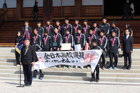ホッケー部男子:第44回全国高等学校選抜ホッケー大会「優勝」報告会 2013年04月03日(水) |クラブだより|ホッケー部|体育系| 第44回全国高等学校選抜ホッケー大会「優勝」報告会 (3月30日(土)午前9時30分~10時00分 於:天理教本部 南礼拝殿前) ホッケー部・男子が、第44回全国高等学校選抜ホッケー大会で、見事4年ぶり8回目の優勝を成し遂げ、「優勝」報告会を行いました。神殿前で、三殿立拝の後、学校長の挨拶に続き、OBG会代表の祝辞をいただき、最後に部長が謝辞を述べました。 神殿前にて 学校長挨拶 部長挨拶 神殿前の様子 « 前のページホッケー部女子:第44回全国高等学校選抜ホッケー大会次のページ »柔道部女子:第35回全国高等学校柔道選手権大会の結果