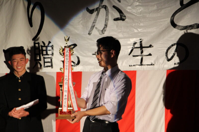 北寮ふしん寮 予餞会(令和5年度) 2024年02月20日(火) |北寮ふしん寮|学寮だより| 1月31日(水)北寮ふしん寮食堂に於いて北寮ふしん寮予餞会(テーマ:ありがとう ~ 笑顔で贈る一生の思い出~)が行われた。 寮長先生より卒寮生に祝辞が述べられ自治会功労者、皆出席者が表彰を受け記念品が贈呈された。 卒寮生、在寮生からの出し物では全員で一つの事に取り組む事を大切に、漫才やダンス、歌を披露し会場は終始楽しい雰囲気につつまれた。 予餞会の途中には校長先生、副校長先生にそれぞれ祝辞を卒寮生に対していただいた。自治会の企画である北寮ランキングではMr北寮に選ばれた平野晃弘さん(2階3年)がトロフィーを受け取り、大いに盛りあがった。そして終盤に3年間の歩みを記録した映像が流れると卒寮生は目に涙を浮かべ、幹事さんからの卒寮生に捧げる歌の後には幹事さんの下へ駆け寄り別れを惜しむ感動の予餞会となった。会場を去る際には在寮生が各フロアで花道を作って見送り、互いに別れを惜しむ卒寮生と在寮生の姿も見受けられた。 寮長祝辞 送辞 校長祝辞 副校長祝辞 卒寮生による出し物 卒寮生による出し物 トロフィー授与 卒寮生の集合写真 « 前のページみのり寮 予餞会(令和5年度)次のページ »北寮ふしん寮 卒寮式(令和5年度)