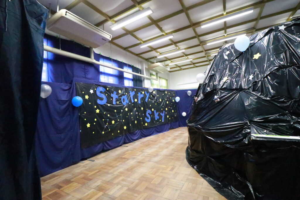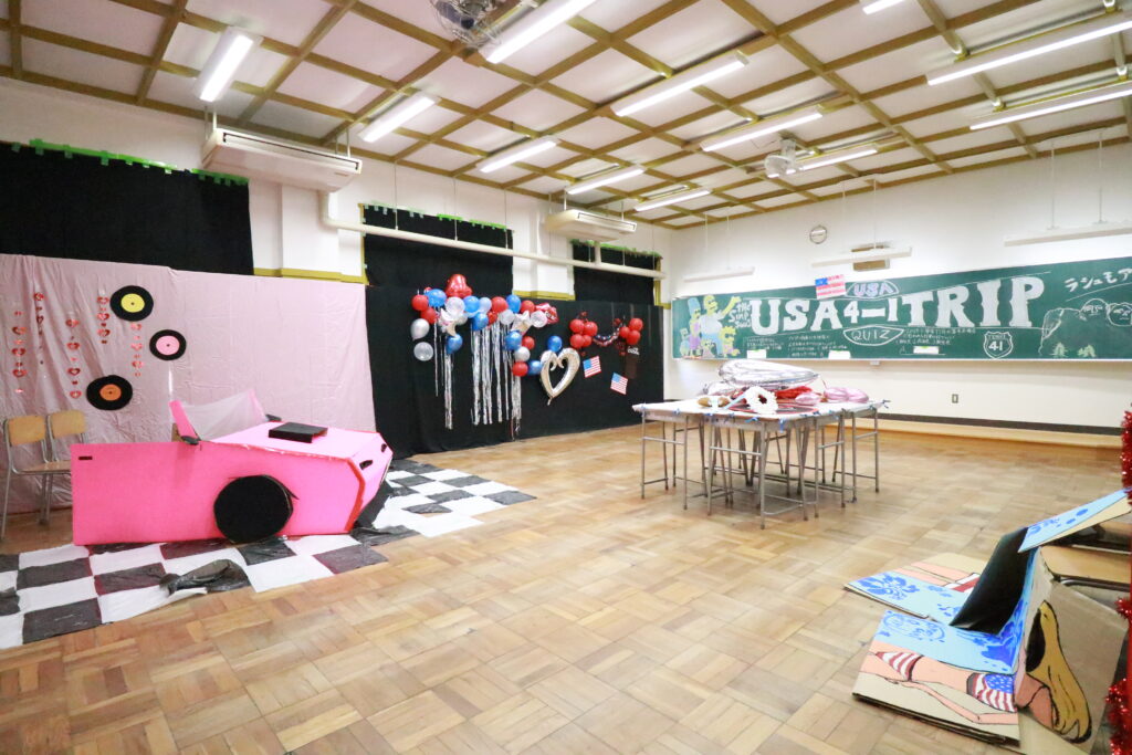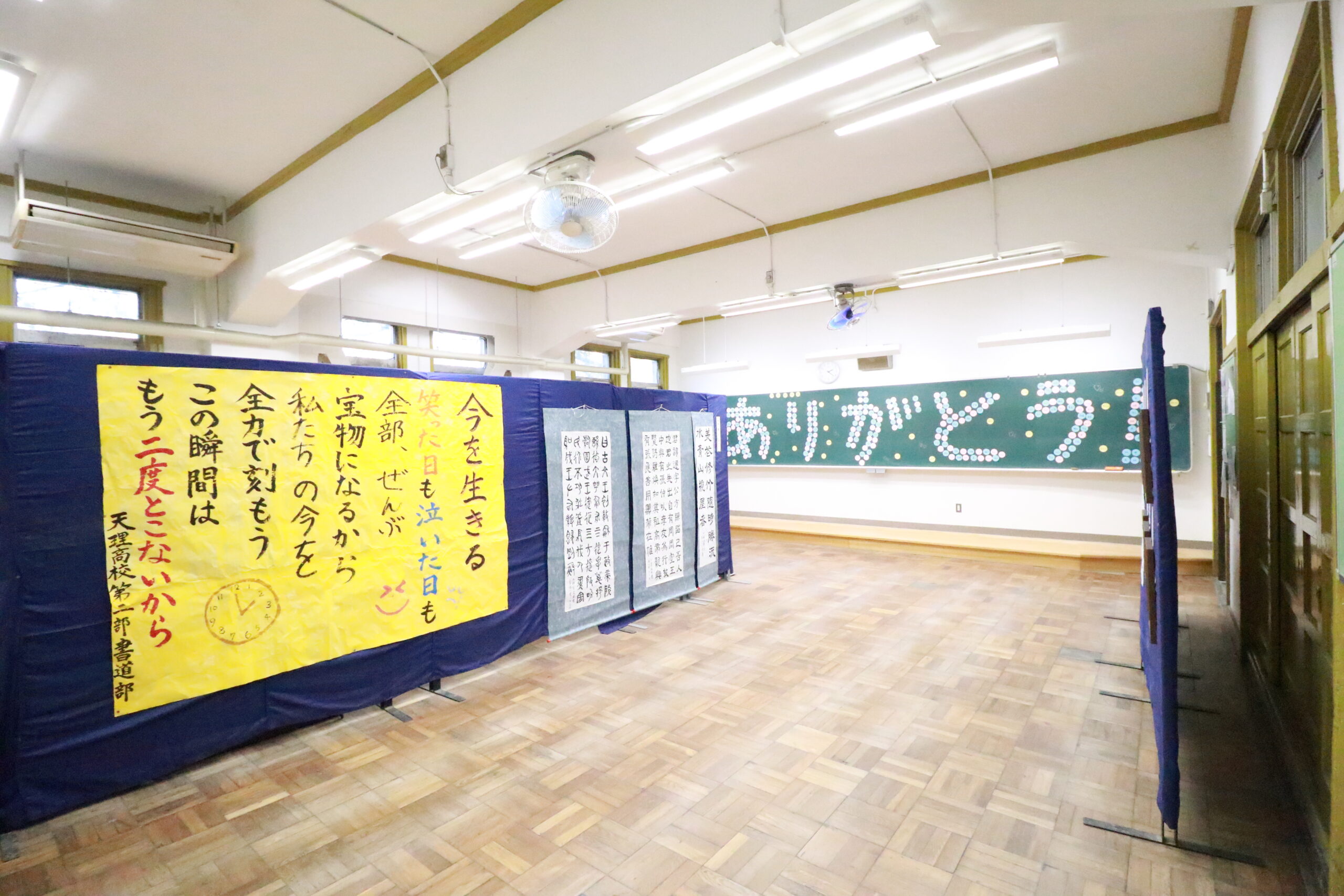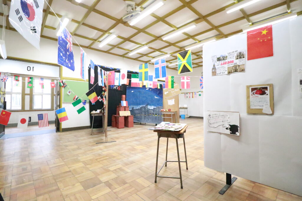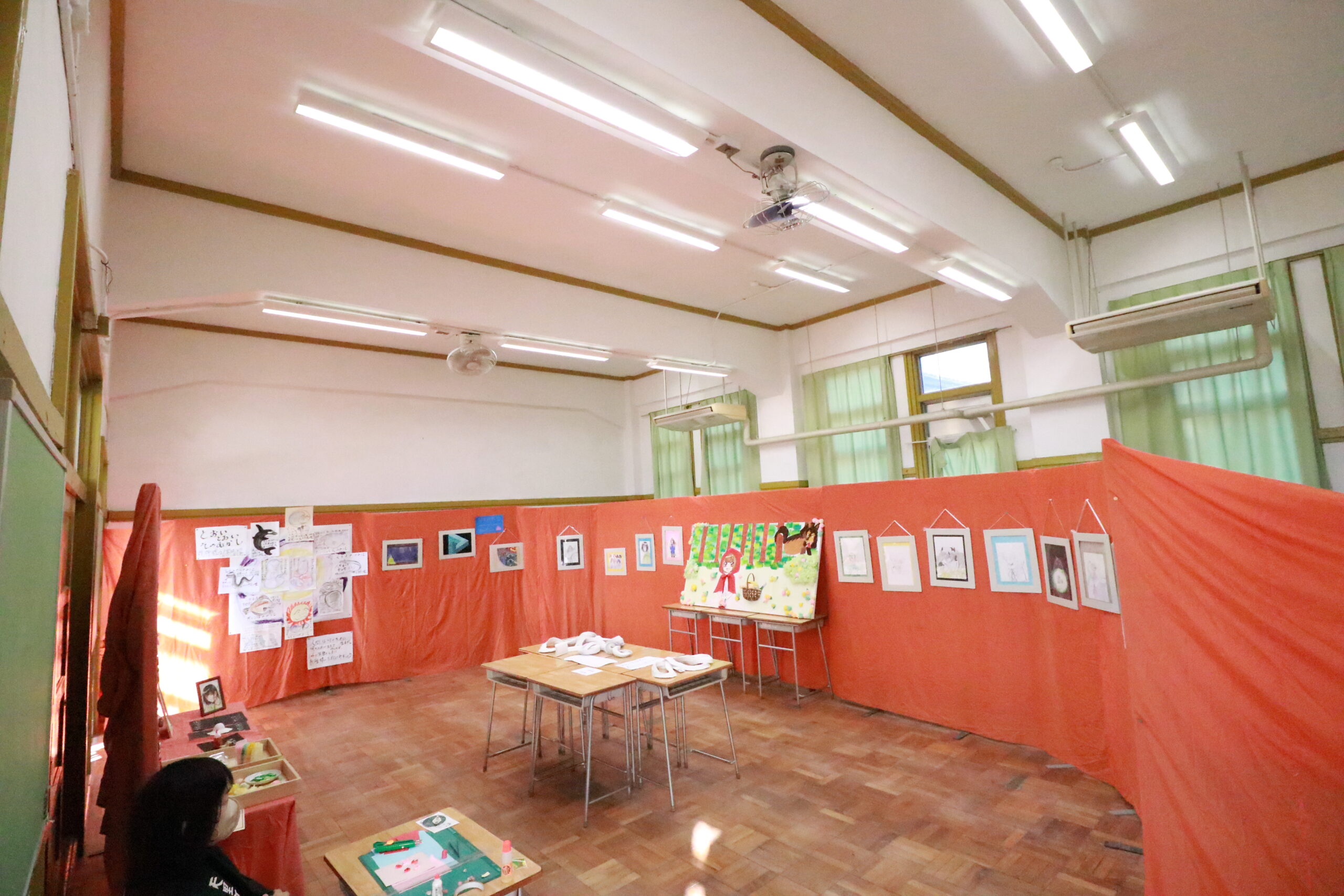 「作品展示の部」では”二部万博”をテーマに世界や二部の文化に関する7グループの出展がありました。クラス出展は4年生の3クラス、つとめ先出展は水道課と現場第二班の共同作品、造園課と電気課の共同作品、部活動は書道部、美術部の作品が展示されました。